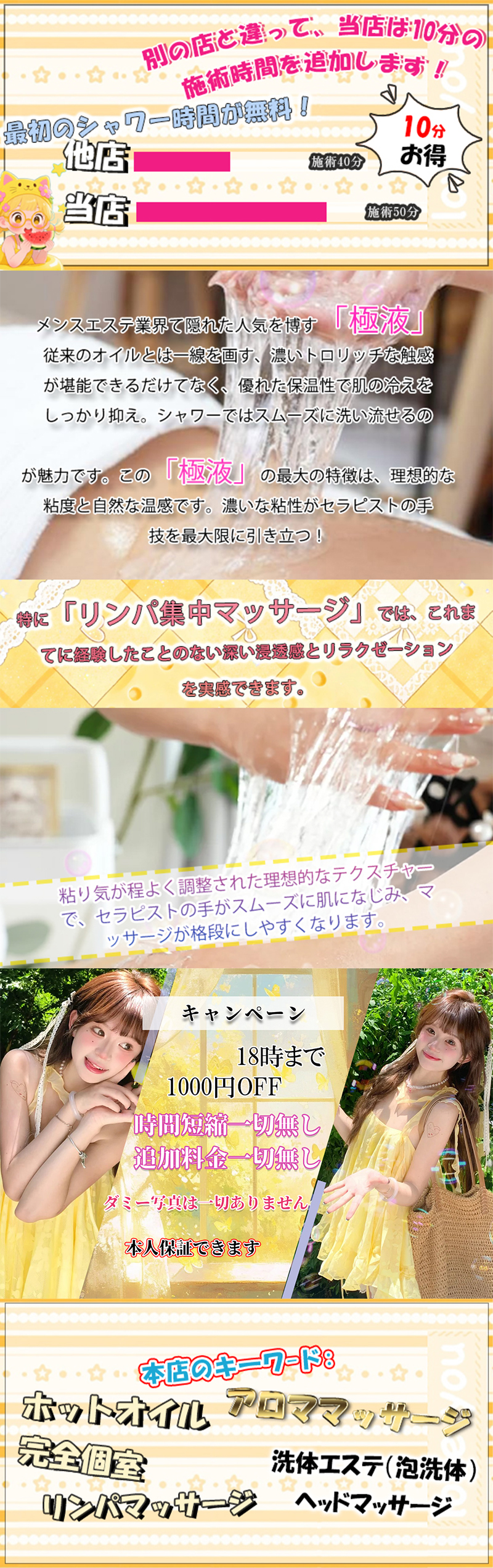 当店では、アロマオイルの効能と当店自慢のセラピストによるリンパマッサージの相乗効果による、癒しのひとときをお客様お一人お一人にお届けしております、自然で心やすらぐ優美な香りを、施術中はもちろんご帰宅お休みになってから翌日朝目覚めでまで楽しんで頂けます、どうぞゆっくりご堪能ください。